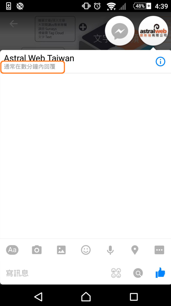 此設定,會顯示在粉絲團首頁的『關於』資訊中和對話視窗的上方,顯示如下圖: