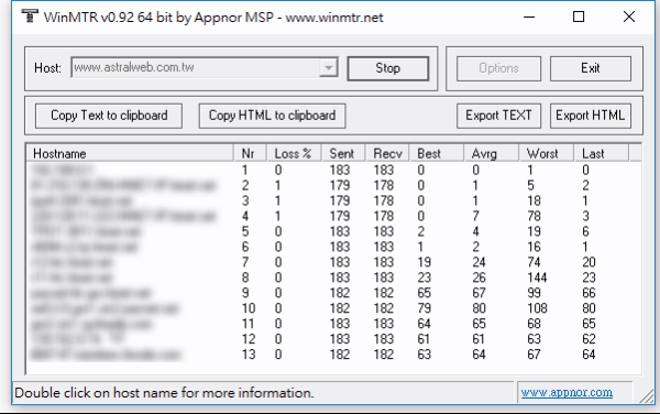 這時最簡單的方式就是使用免費軟體,WinMTR,這是個非常輕巧的Windows軟體,下載後執行如例圖: