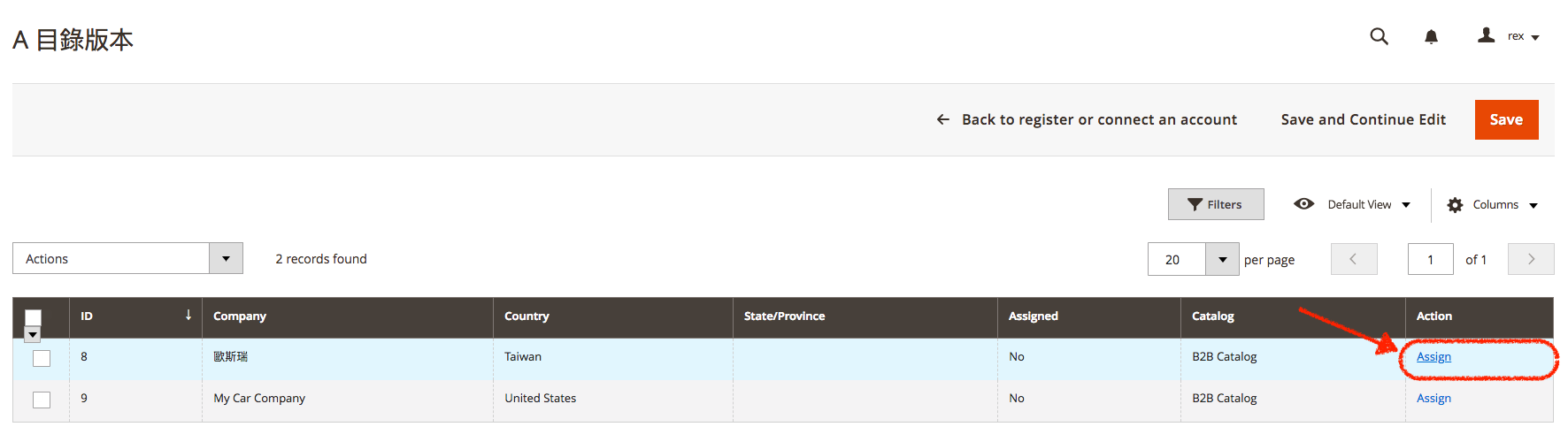 完成後,接下來回到Shared Catalogs列表,點選剛剛到「A版本目錄」的Assign Companies, 來把這個目錄版本分配給我要指定的客戶。