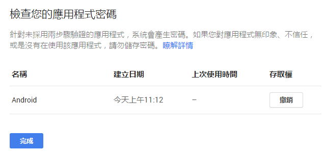 您也可以幫某些裝置或程式設定應用程式專用的密碼。使用應用程式專用密碼時,您只要在輸入密碼時使用"專用密碼"之後就不需要再輸入驗證碼。使用應用程式密碼的好處是,您還可以在Google帳戶中管理應用程式專用密碼。