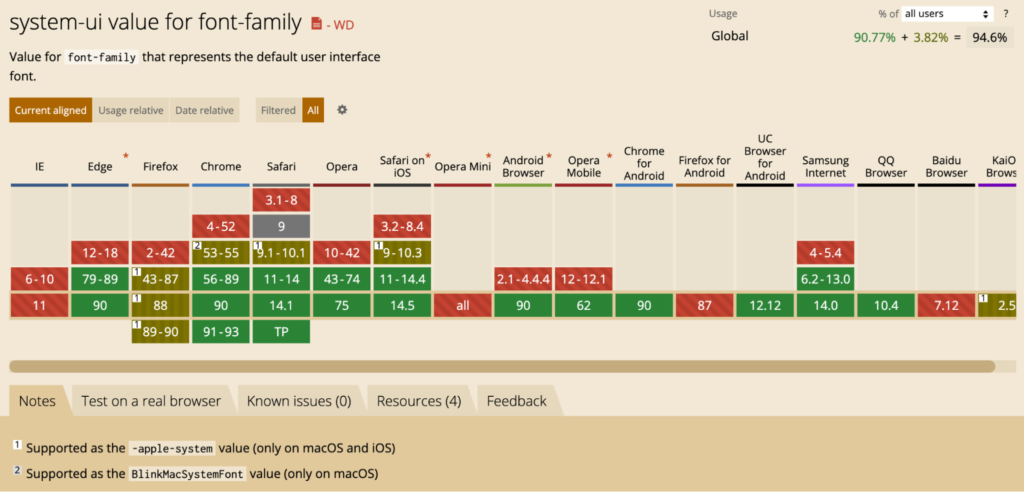 而其中 system-ui,在網站上使用的頻率逐漸提高,許多大型網站都以 system-ui 作為第一考量,例如 Pinterest, Bootstrap, CSS-Tricks等。這就又回歸我們在前文所要強調的重點,使用特定作業系統的 System Fonts 可以提高性能,因為瀏覽器或者 webview 不必額外載入任何字體文件,而是使用已存在的字體。 font-family: system-ui 字體設置的優勢在於它與當前作業系统使用的字體相匹配,對於内容而言,也可以得到切當的展示。