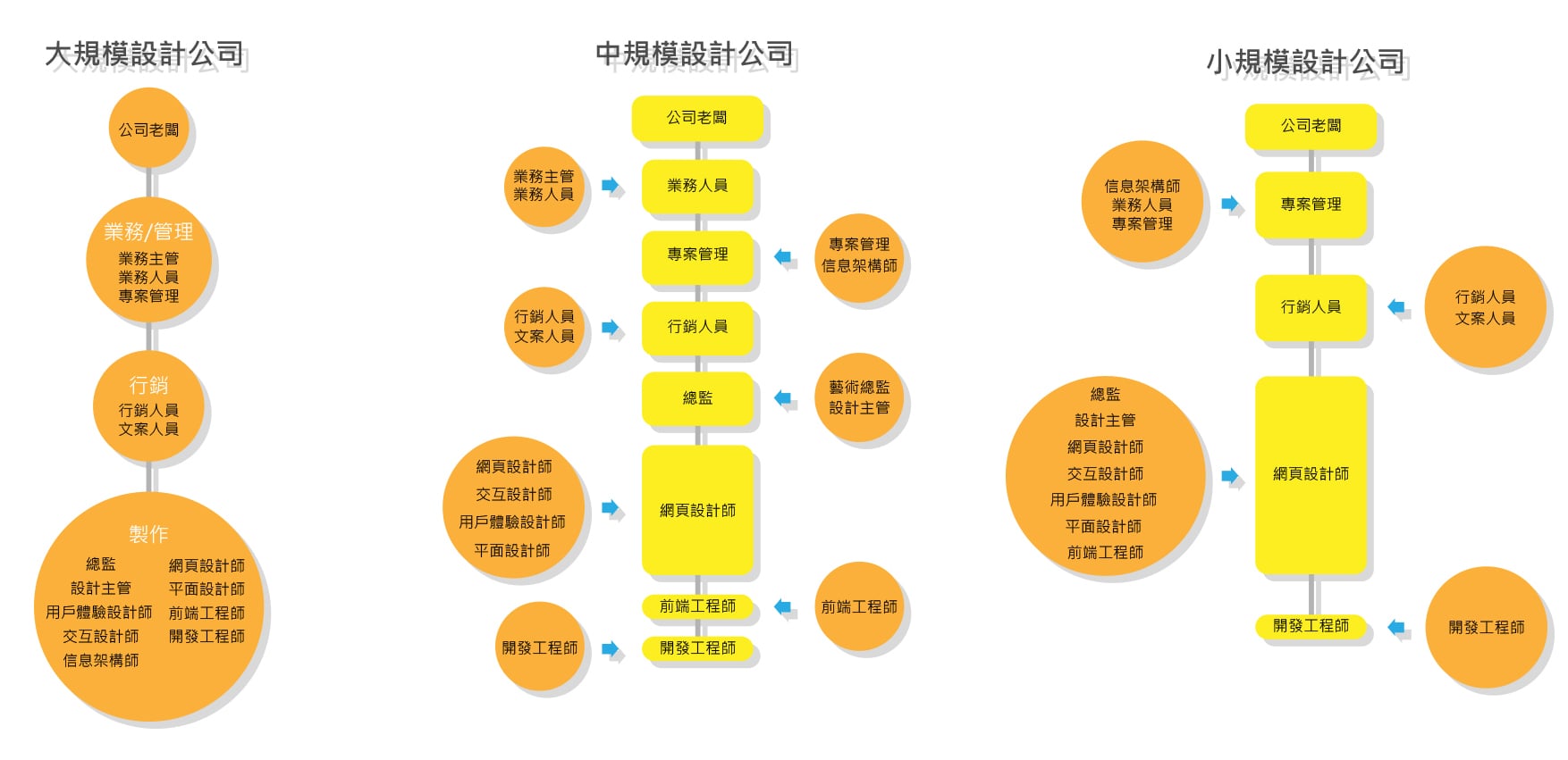 在網頁設計專案進行中,設計師是屬於前端部份與客戶較密切聯繫的角色,僅次於專案管理人員,並透過專案管理所提供資料,依網站架構與在合約規範內,去設計符合客戶需求之網站視覺,所畫的內容都會與網站功能息息相關。在設計階段中修改是免不了的問題,但多次的修改會不斷增加專案時程以及公司的成本,在理解問題前,我們先了解設計公司與客戶之間的關係,我們簡單歸納出以下不同公司規模的案主與設計公司。